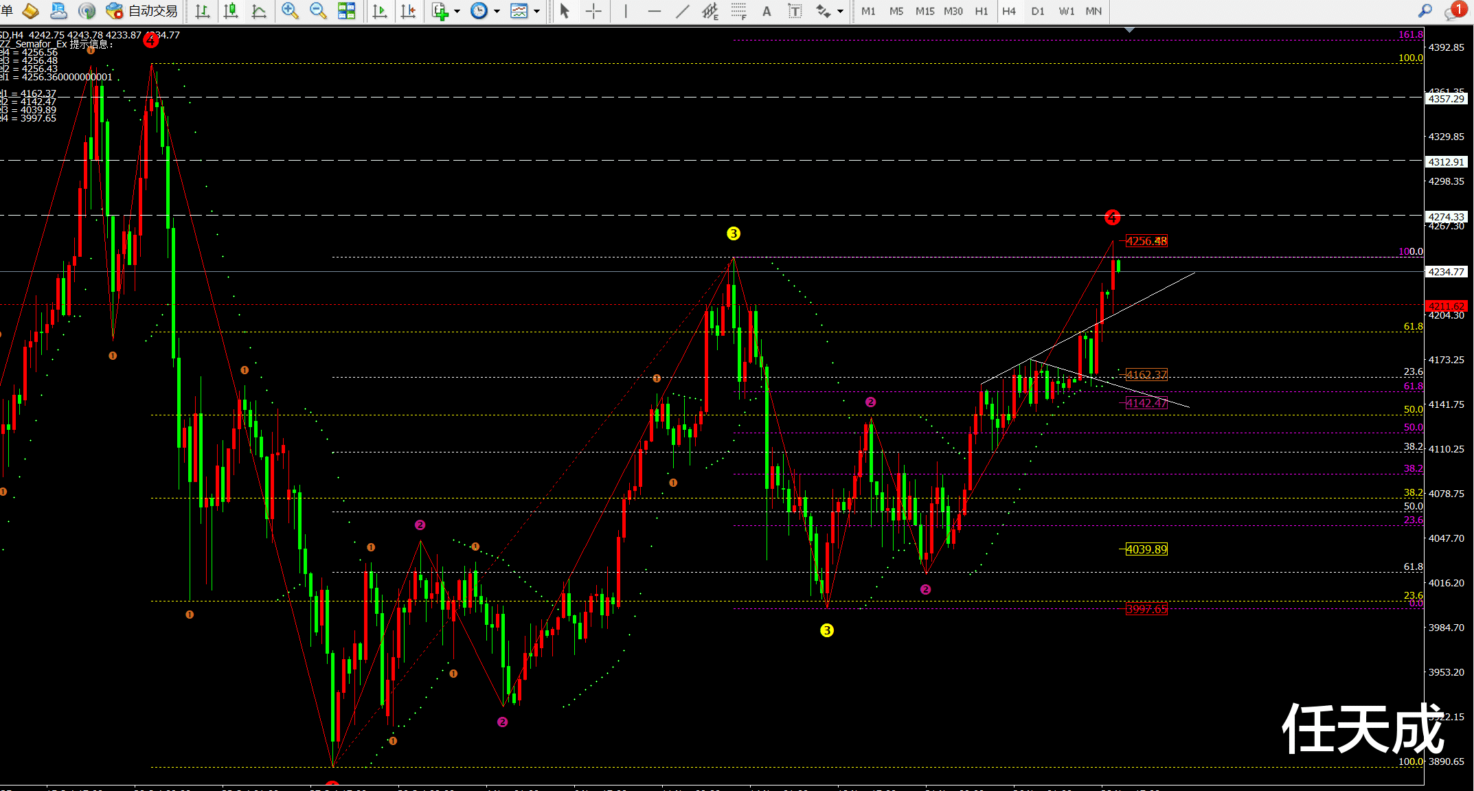 因为4小时已经突破了前期的高点4245一线,因此上方的阻力变成4275-4315-4357附近。所以我们再次空得等到4275附近,而多单位置位于4210-12附近。