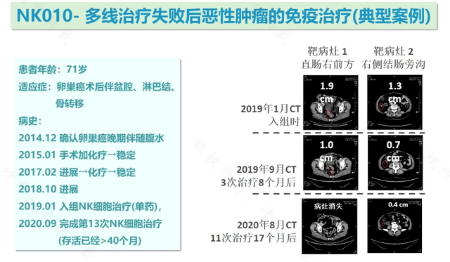 入组患者为预计生存期仅2-6个月的终末期患者。其中一名患者于2014年确诊晚期卵巢癌,经历标准治疗(手术+化疗)后于2018年进展,基线影像显示:直肠右前方病灶1.9cm,右侧结肠旁沟病灶1.3cm,NK010治疗后,直肠右前方病灶消失,右侧结肠旁沟病灶缩小至0.4cm。截至2020年9月,该患者已经存活至少40个月。