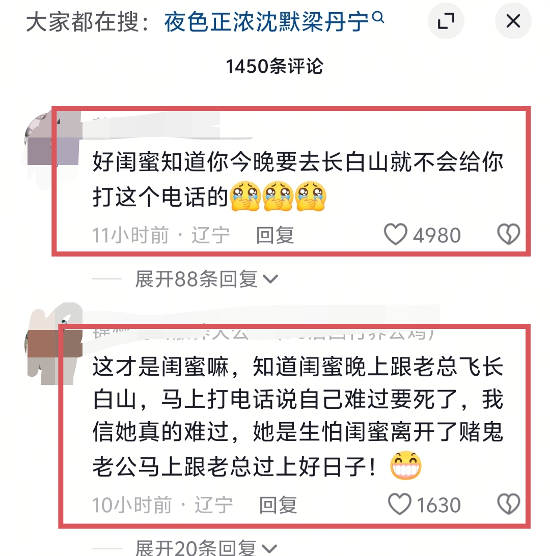 图片来源:相关截图,特别致谢,侵删。《夜色正浓》有段剧情值得深思。梁丹宁刚准备和老沈默去长白山玩,半路接到闺蜜赵玫的求助