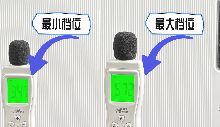 为了了解拾梧FW01在不同档位运行时的噪音表现,确认其是否适合日常和夜间长期使用。所以用噪音计在距离拾梧FW011米的位置,分别测量最大档位和最小档位运行时的噪音数值,测试环境保持安静。
