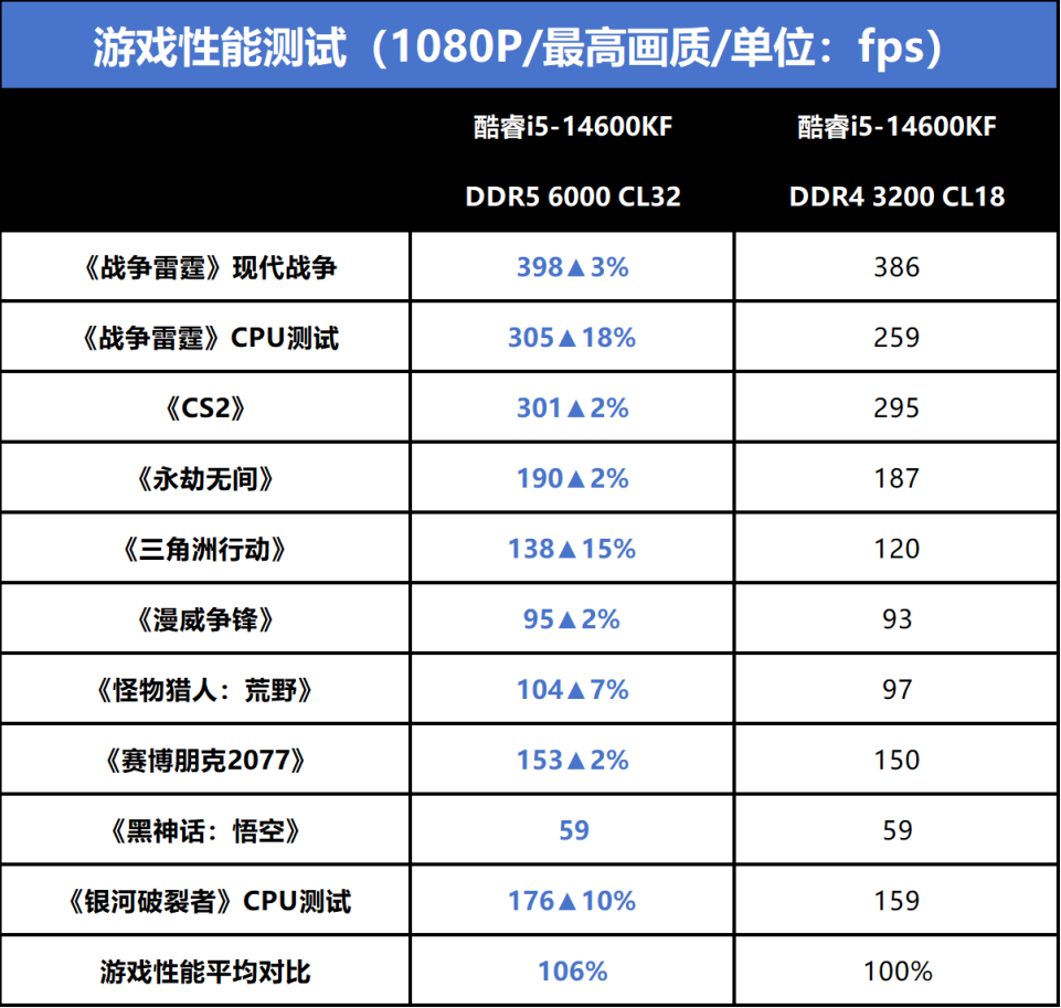 另外在《怪物猎人:荒野》这样的多人游戏中,酷睿i5-14600K+DDR5 6000相对酷睿i5 14600K + DDR4 3200的优势也是很大的,领先幅度达到了7%。综合全部游戏来看,酷睿i5-14600K+DDR5 6000平均领先的幅度为6%。可见在内存延迟并不占优势的前提下,DDR4 3200内存确实拖了酷睿i5-14600K很大的后腿。