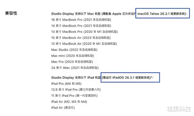 在昨天发布的新款 Studio Display 和 Studio Display XDR 显示器的兼容性列表中显示需要 iPadOS 26.3.1 或者更新系统。