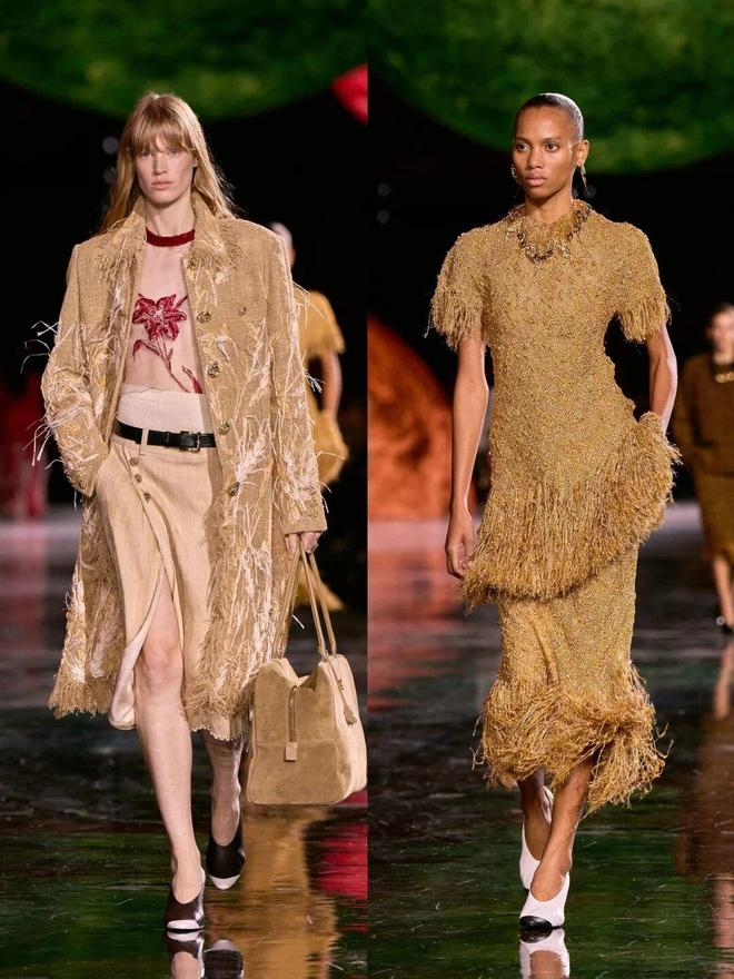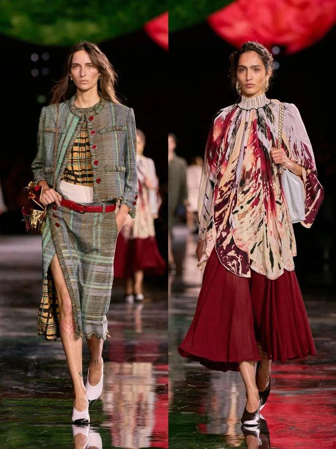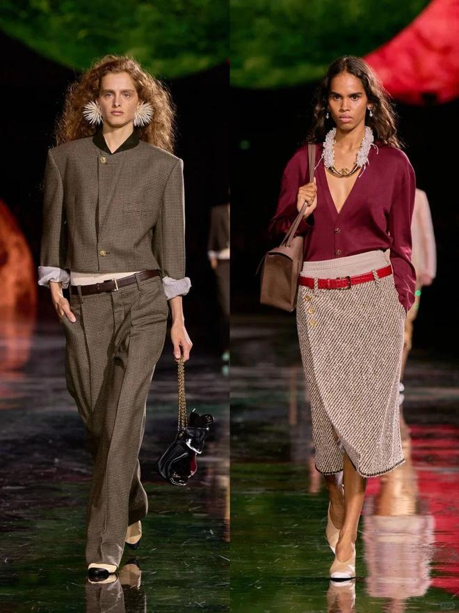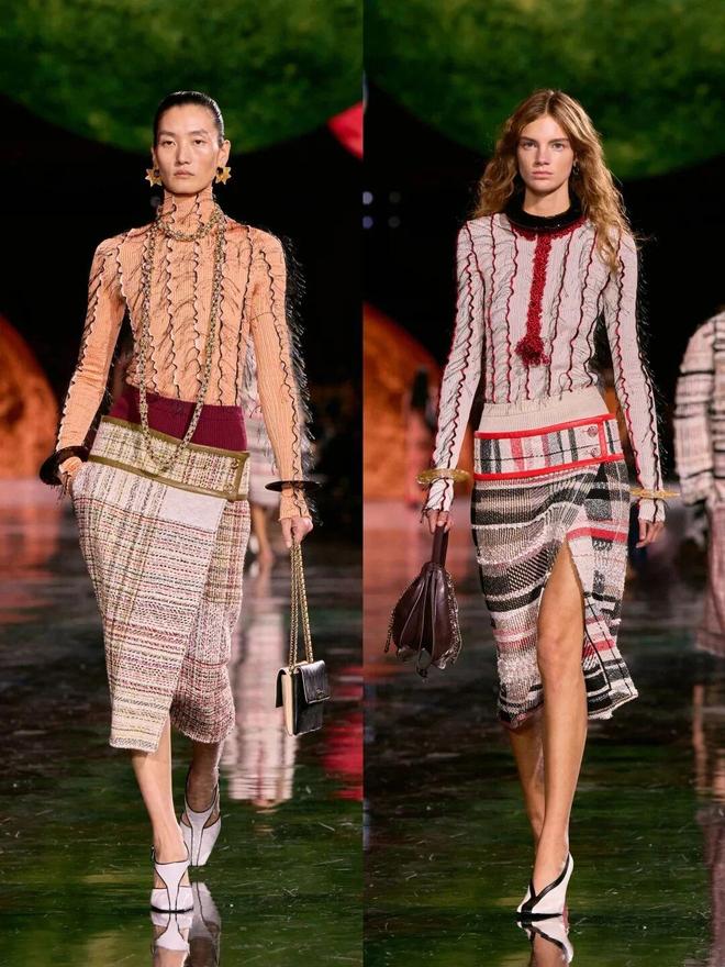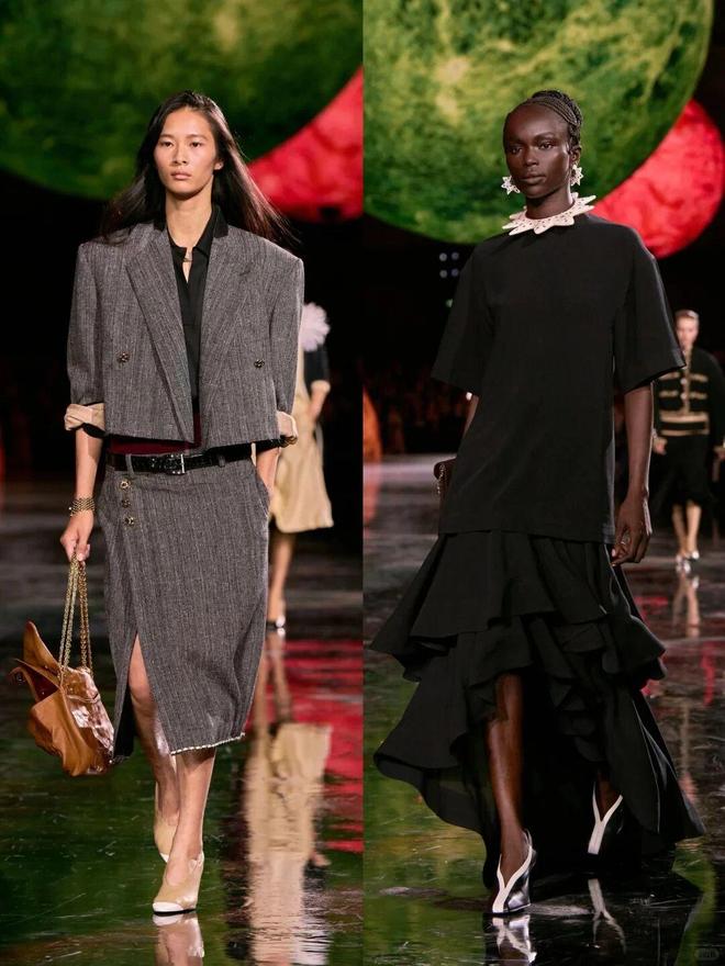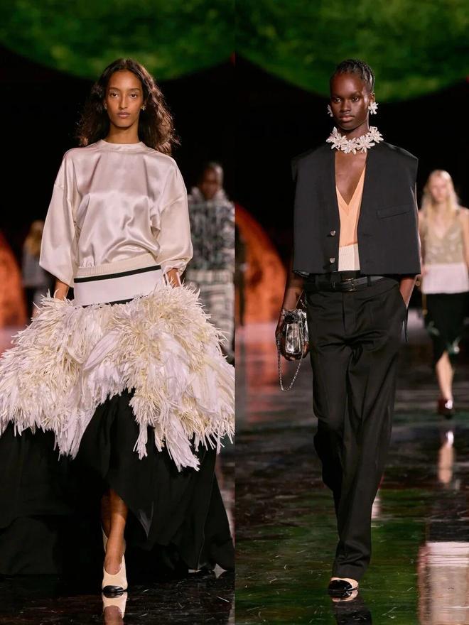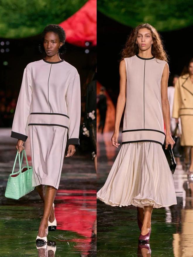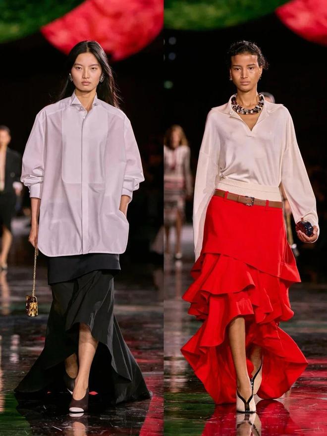 布拉齐在设计中融入了独特的剪裁和优雅的线条,展现了对女性气质的深刻理解与诠释。他参考了品牌在20世纪20年代或是70与80年代的形象,如低腰半裙、H型长裙的廓形或是带有黑色滚边的全白造型等。