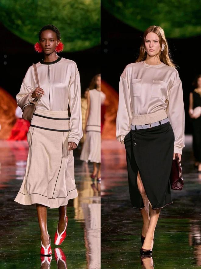 2、复古廓形当代化:借鉴20年代H型长裙、70-80年代低腰半裙的秀场元素,搭配当代简约单品——H型长裙可配基础款针织衫,低腰半裙搭短款卫衣,用现代单品中和复古廓形的年代感,避免整体造型违和。