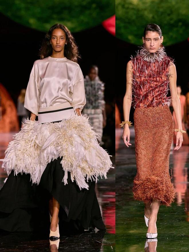 1、华丽与休闲碰撞:复刻秀场缎面T恤+羽毛蓬蓬裙的思路,日常可用软呢外套搭配牛仔裤、帆布鞋,或用缎面吊带搭配利落西裤,以材质反差平衡风格,让奢华单品更接地气。也可尝试露出台球鞋尖的裙摆搭配,用街头感单品打破礼服或正装的刻板。