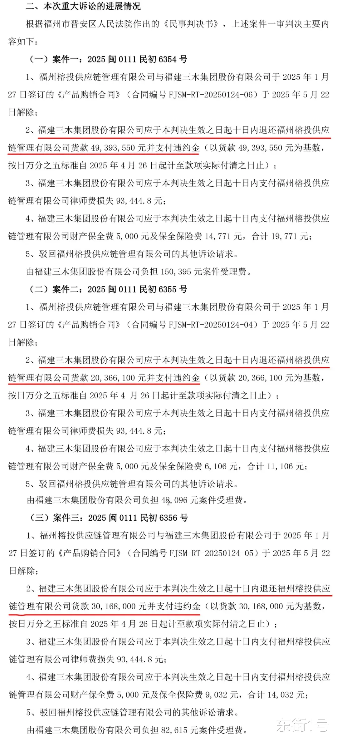 早在去年7月,收钱不供货的三木集团就被福州榕投诉讼约1亿元。根据三木集团今年1月17日发布的公告,7月诉讼的三个案件,福州市晋安区人民法院已于近日做出一审判决: