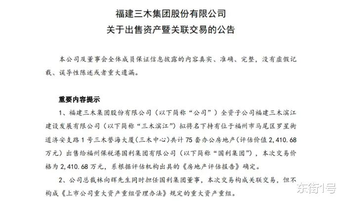 2025年12月10日,福建三木集团发布公告称,其子公司拟将名下75套办公房产出售给关联方福州保税港国利集团,标的物是位于福州马尾区罗星街道的三木誉海大厦(又称“三木中心”)。