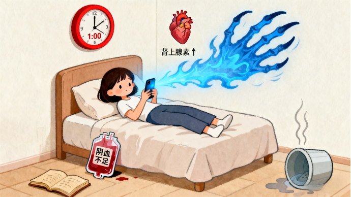 中医解释中医则说 “熬夜伤阴血”:晚上是血“休养”的时间,熬夜会让血一直“工作”,没时间补充营养,长期下来会“阴血不足”——血不够,气推血的动力也会弱,容易出现气血两虚,比如我当时心慌,就是气血不足,心脏“没力气跳”了。
