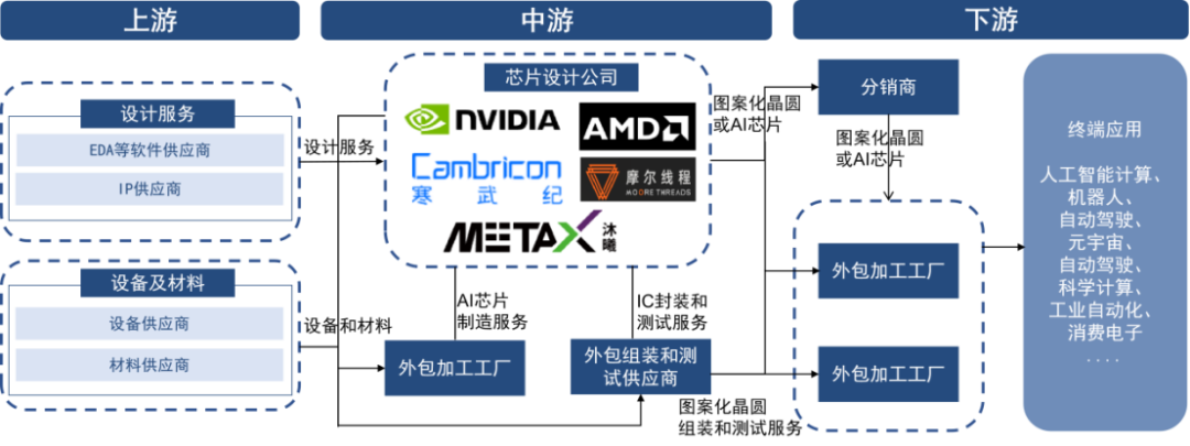 下游为GPU应用领域。分销商负责销售GPU,而系统制造商则负责将GPU集成到终端产品中,并最终交付给品牌商。最终应用下游包括AI计算加速、机器人、自动驾驶、元宇宙、数字孪生、科学计算、工业自动化、消费电子等众多行业。