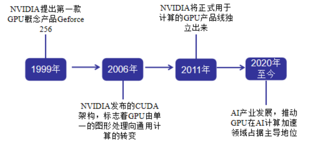 GPU的早期版本主要用于图形渲染。随着技术的进步,GPU的并行计算能力被挖掘,GPU也逐渐被应用于科学计算和数据分析领域。2006年,NVIDIA推出CUDA,这是全球第一个通用并行计算架构,标志着GPU由单一的图形处理向通用计算的转变。2022年,随着ChatGPT的爆火,在加速计算和生成式AI的带动下,算力需求陡增,GPU需求量也随之大幅增长,高端AI专用芯片供不应求。