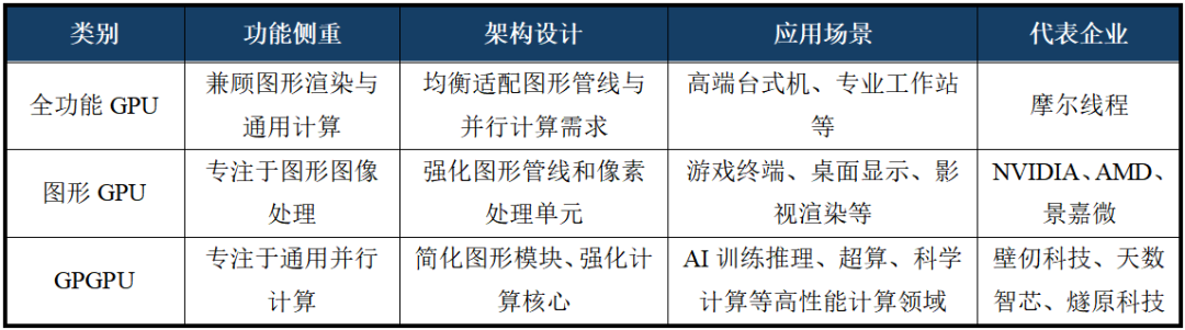 根据功能定位,GPU主要分为图形GPU、GPGPU和全功能GPU。图形GPU聚焦图形图像相关处理,其核心架构强化了图形管线与像素处理单元,重点服务于游戏终端、影视渲染等视觉相关场景;GPGPU则省去了与图形显示和渲染相关的功能,专注于通用并行计算任务,通过简化图形模块、强化计算核心的架构设计,广泛应用于AI训练推理、超算、科学计算等高性能计算场景;全功能GPU兼具图形渲染与通用计算能力,其架构兼顾图形管线与并行计算需求,可适配多元化应用场景,常见于高端台式机、专业工作站等设备。