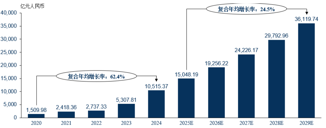 在全球范围内,欧美等发达国家及地区在AI领域的研发起步较早,早期资本投入较大。过去五年,全球AI算力需求激增使GPU市场爆发式增长,全球GPU市场规模从2020年的1,509.98亿元快速增长到2024年的10,515.37亿元。全球GPU市场规模预计在2029年将达到36,119.74亿元,2025-2029年的复合增长率为24.5%,呈现强劲的增长态势。