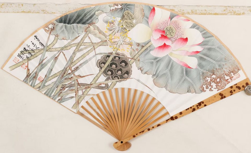 皮伟爱画扇,尤爱折扇工笔,这俨然是用画笔与这方寸载体,进行着一场跨越千年的艺术对话。其构图之妙,在于擅取宋人法度森严的严谨骨架,却常以元人崇尚的虚空留白来破局,于规矩中求新变。如其画作《映日荷花别样红》,硕大饱满的莲叶自扇缘斜逸而出,几有破“框”之势,而莲蓬谦卑低垂的姿态,与盛放荷花顾盼生姿的回眸,形成巧妙的视觉关联与情感呼应。这一抑一扬,一放一收,顿生关联之意,以无形的气韵流转定住乾坤,于看似失衡的险绝处,缔造出新颖而稳固的画面秩序。
