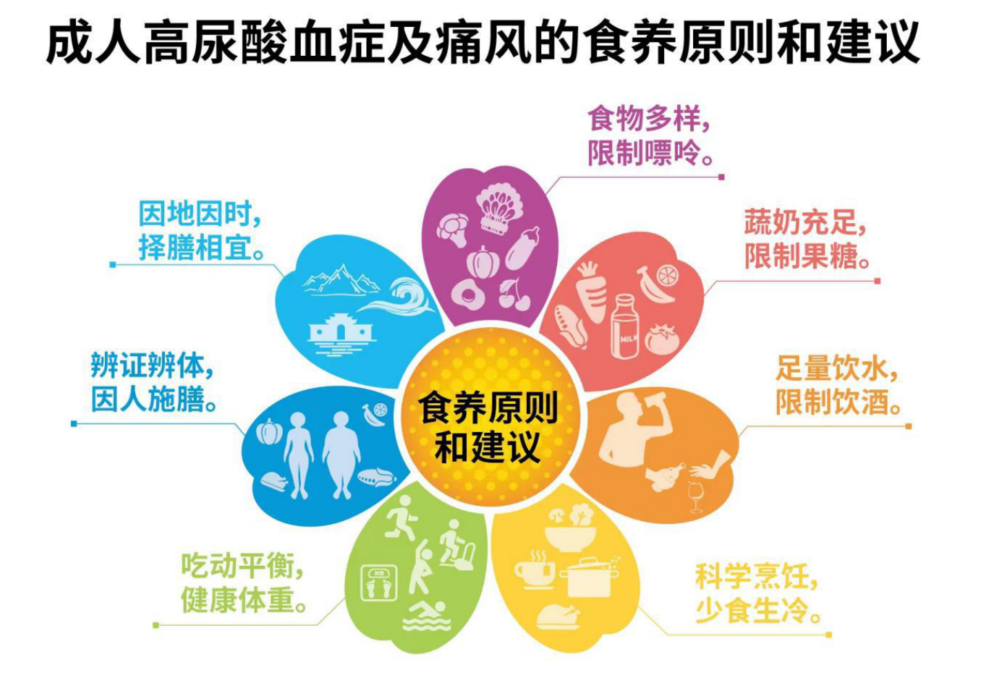 1.食物多样,限制嘌呤。2.蔬奶充足,限制果糖。3. 足量饮水,限制饮酒。4.科学烹饪,少食生冷。5.吃动平衡, 健康体重。6.辨证辨体,因人施膳。7.因地因时,择膳相宜。