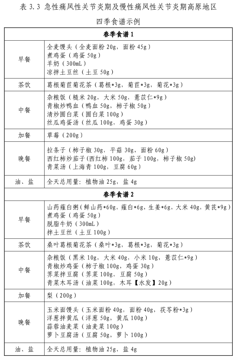 本部分食谱适合正常体重的成年急性痛风性关节炎期及慢性痛风性关节炎期患者,因关节炎发作期间,体力活动受限,一天食谱的能量在 1400~1600kcal 范围。