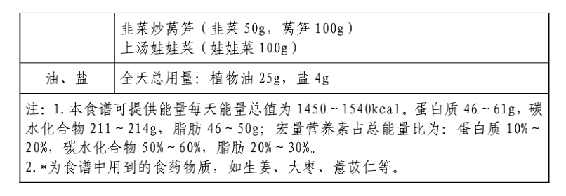 当体重过重或过轻,可以根据理想体重及能量系数15~20kcal/(kg·d)适当调整食材用量。另外,该食谱的食物重量均为其可食部的生重。