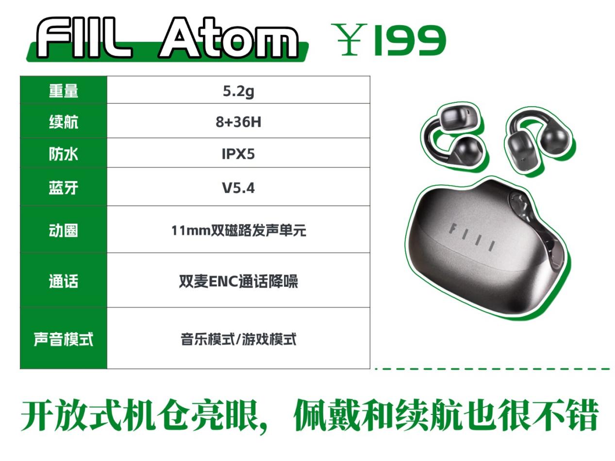 FIIL Atom 则属于没有明显短板的类型,各方面参数都比较均衡。比如续航能到 8+36 小时;防水等级是 IPX5,日常出汗、下雨溅到水基本不用怕;还多了个游戏模式,对偶尔想用耳机打手游的人来说挺实用,整体属于中等偏上的水平。