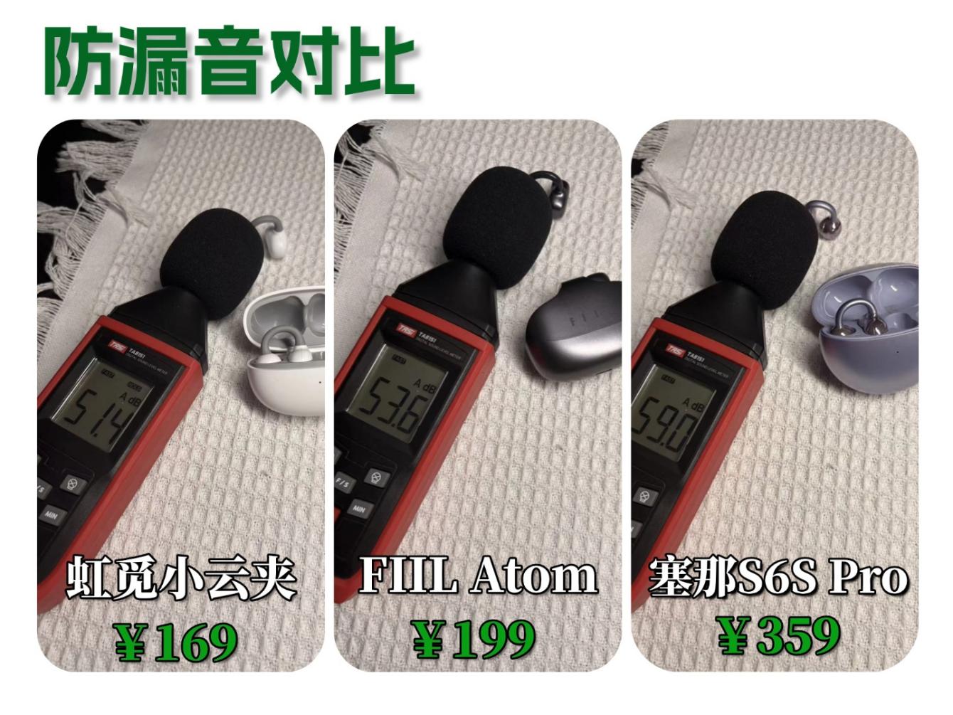 再看防漏音,这方面虹觅 Air2 小云夹做得比另外两款好不少。它有专门的防漏音模式,按三次耳机按键就能开启,靠反向声波抵消漏出去的声音。我之前在办公室试了下,把音量开到 60% 左右,旁边同事说几乎听不见我耳机里的声音。FIIL Atom 和塞那 S6S Pro虽然也做了基础的防漏音处理,但效果就一般了,要是在意隐私或者常在安静场合用,这点得留意。
