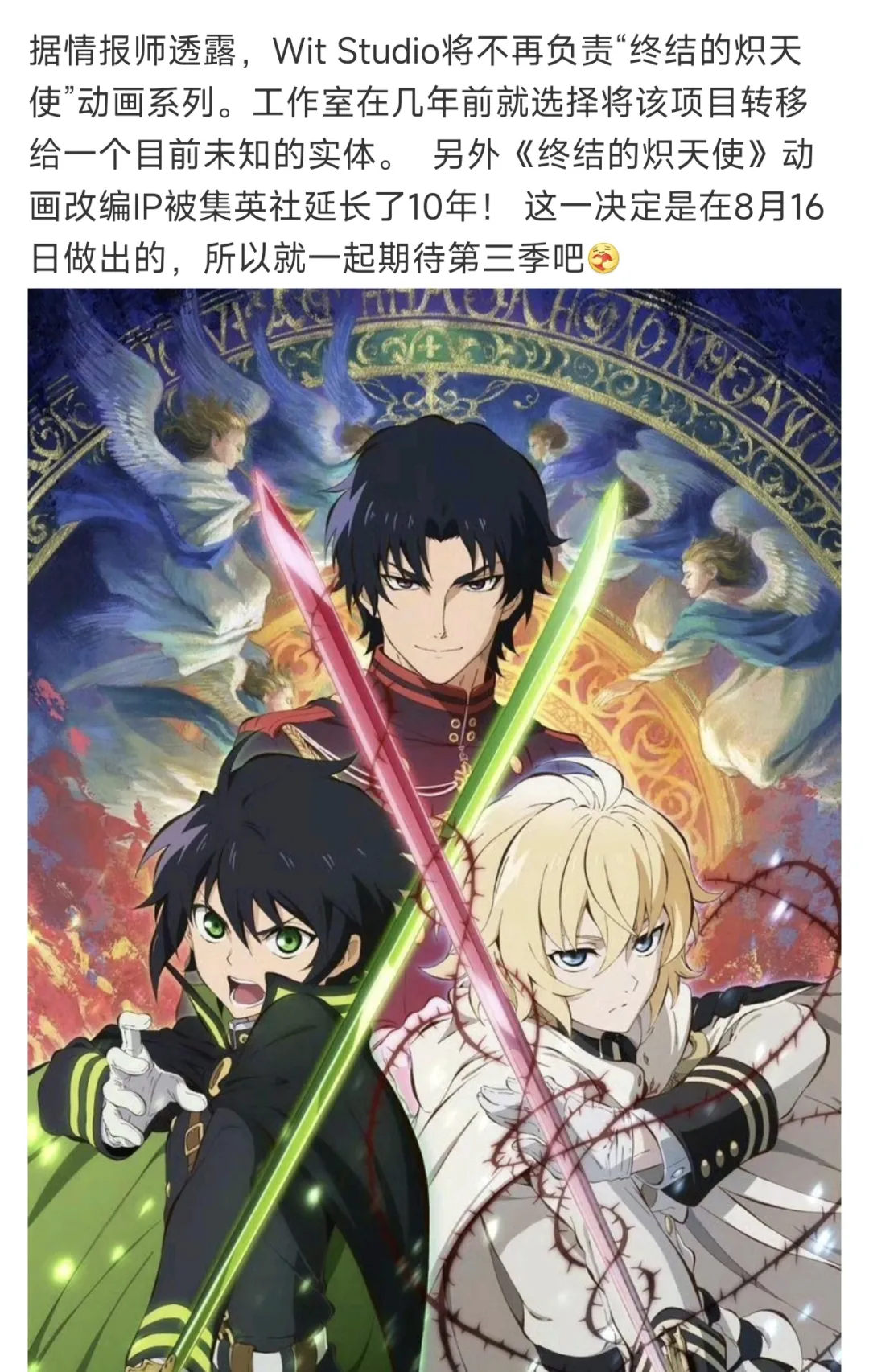 根据有关博主爆料,WIT STUDIO,也就是当年《终结的炽天使》第一季和第二季动画的制作公司,已将不再负责该动画,该项目企划早已经被转移到另一家制作公司。