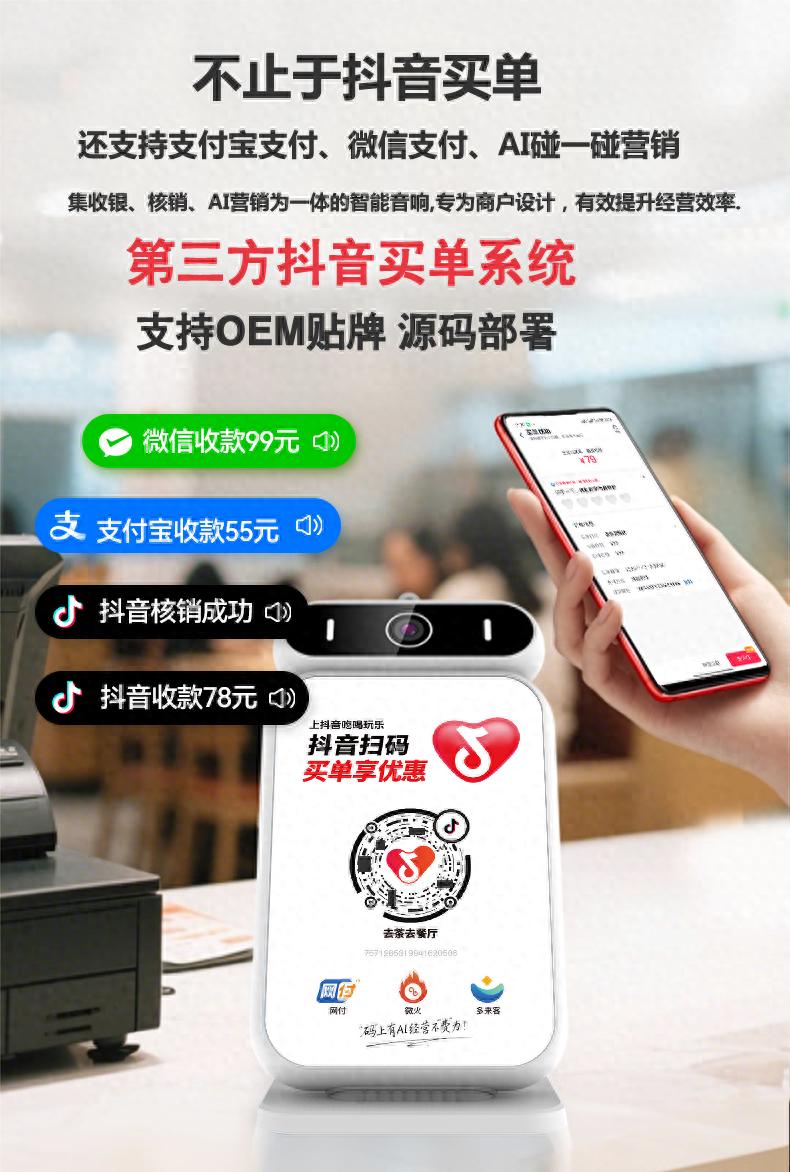 网付研发的抖音买单系统不仅支持抖音买单、还支持支付宝、微信、云闪付、数字人民币支付。同时还支持AI碰一碰营销,是集收银、核销、AI营销为一体的买单系统。如果你最近正在了解抖音买单,关注我私信我将带你了解更多。