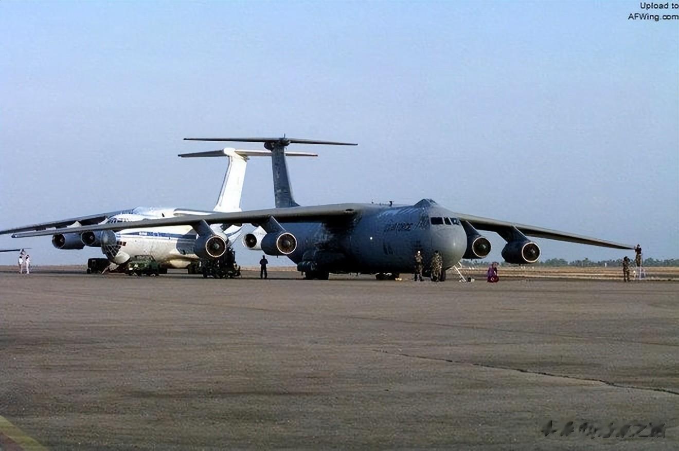 图示:难得一见的美制C-141运输机和俄制伊尔-76运输机相伴左右的照片。两机在外观上有许多特征接近,可以说在设计理念上互有短长。