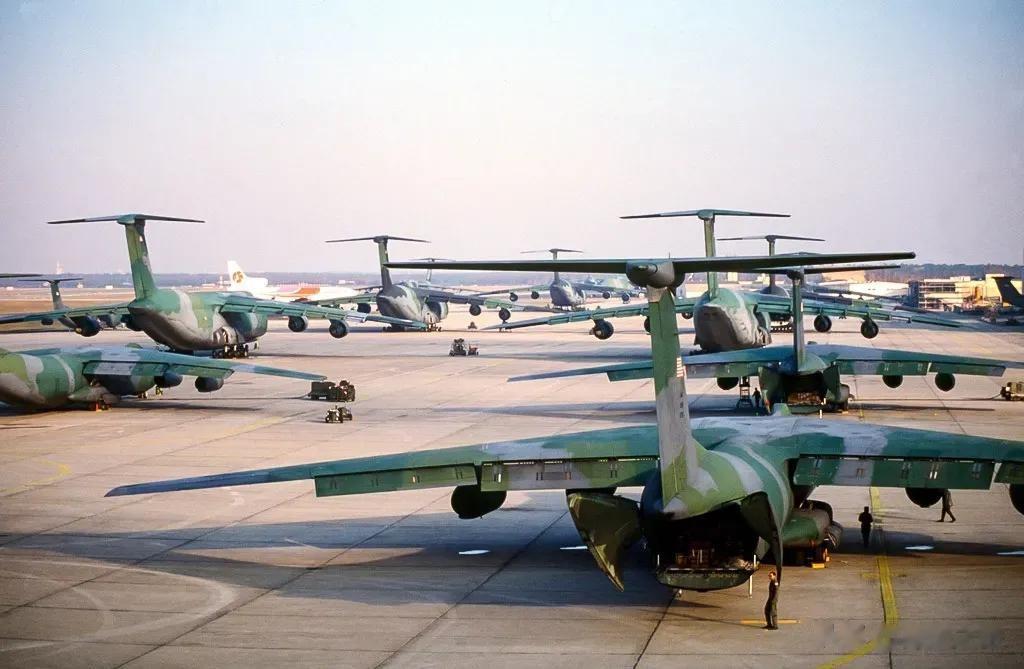 1990年11月,“沙漠盾牌”行动第二阶段,德国莱茵-美因空军基地里的美国空军C-5和C-141运输机,