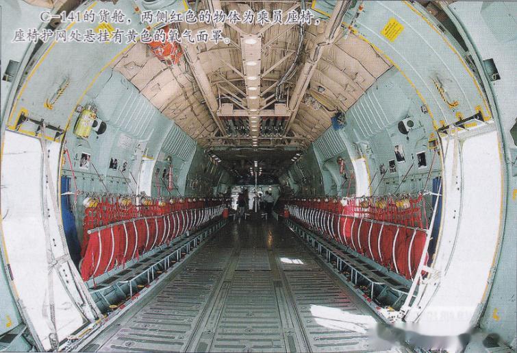 C-141的货舱,两侧红色的物体为乘员座椅,座椅护网处悬挂有黄色的氧气面罩。