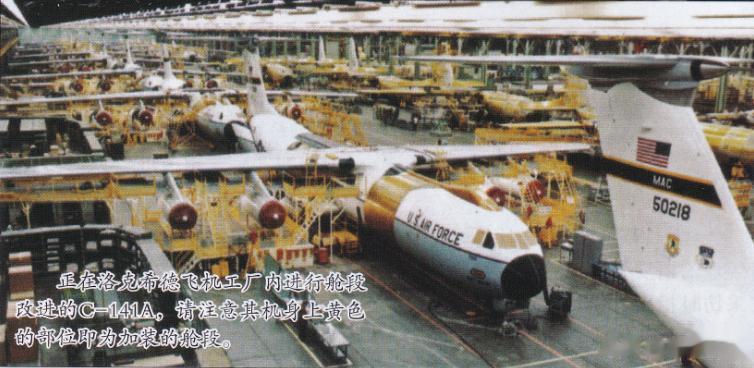 正在洛克希德飞机工厂内进行舱段改进的C-141A,请注意其机身上黄色的部位即为加装的舱段。
