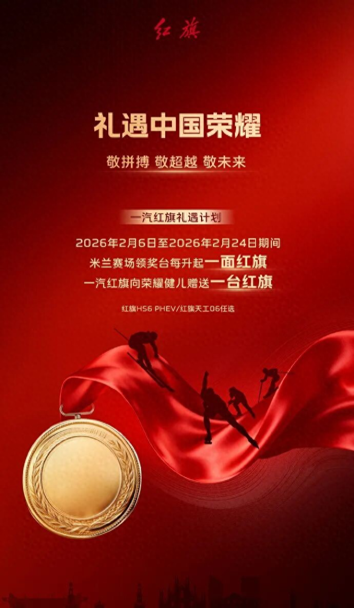 中国第一汽车股份有限公司官方微博2月8日消息,红旗礼遇计划正式启动:2026年2月6日至2026年2月24日期间,米兰赛场颁奖台每升起一面红旗,一汽红旗向荣耀健儿赠送一台红旗。
