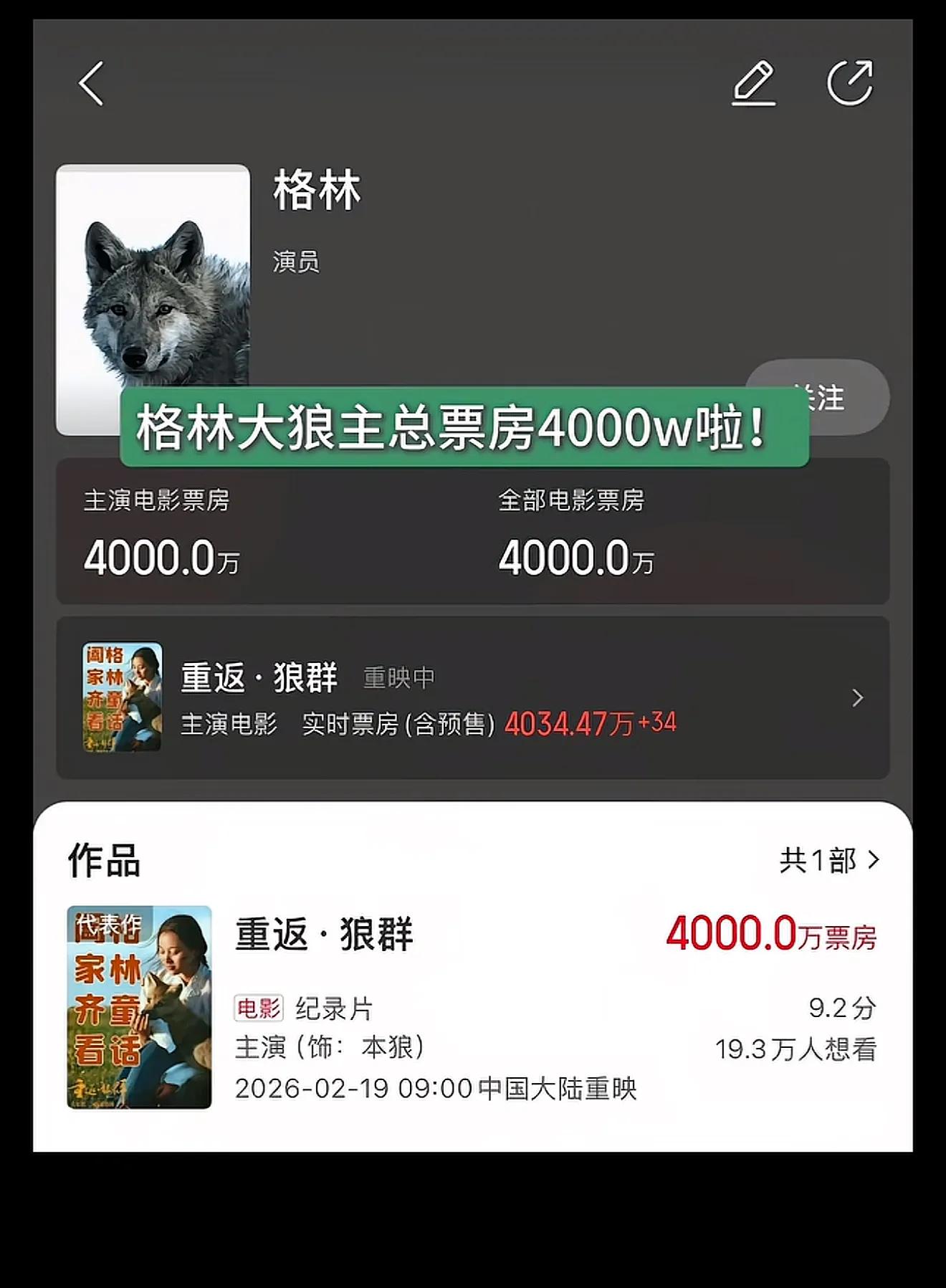 谁能料到?在春节档院线全是商业热门院线影片抢风头下,一部9年前的纪实老片直接炸场!排片少到可怜仅占1%,小县城压根看不到场次,北京一个区7家影院只排1场大年初三早场,网友怒喊“是不是纪录片就不配排片”,可即便如此,2月19日票房显示,它依旧硬生生冲到4000万!这只叫格林的狼,到底凭什么让众多网友为它鸣不平、为它落泪?