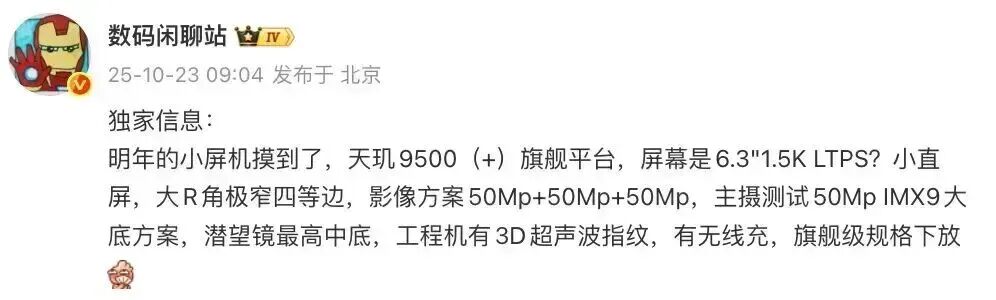 这位博主此前的一份爆料显示,某厂明年推出的小屏手机将搭载天玑 9500(+)旗舰平台。