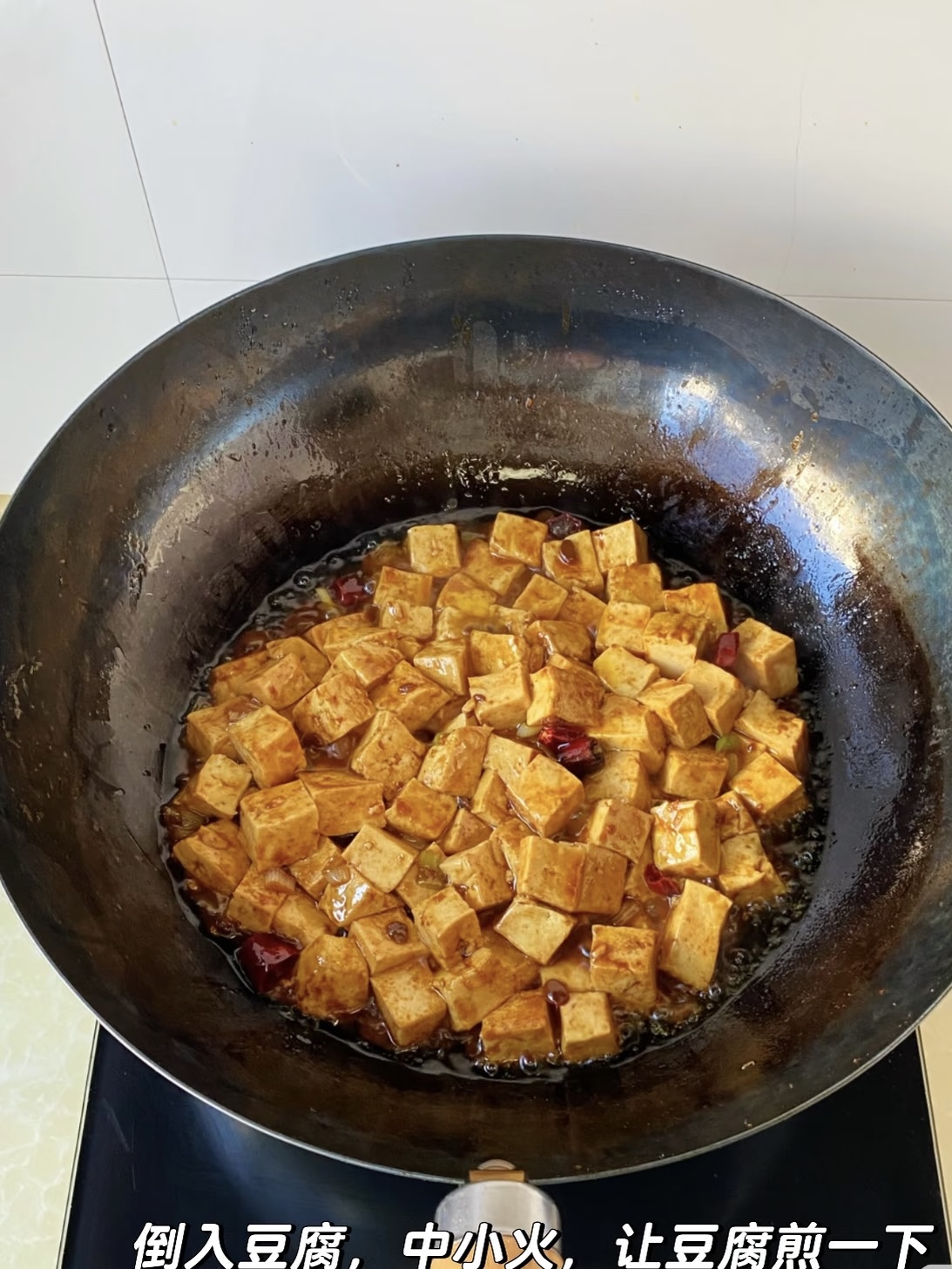 平底锅预热到冒烟,倒油铺满锅底,油热轻轻下豆腐,先不动,让表面定型30秒再推,中小火煎至四面金黄,边缘起泡像“蕾丝裙”,约4分钟。煎完把豆腐推到一边,空出的“黄金位置”倒入酱汁,转小火,让豆腐在“琥珀温泉”里泡澡,用勺背不停淋顶部,3分钟后酱汁变浓,像给豆腐穿件“黄金风衣”。