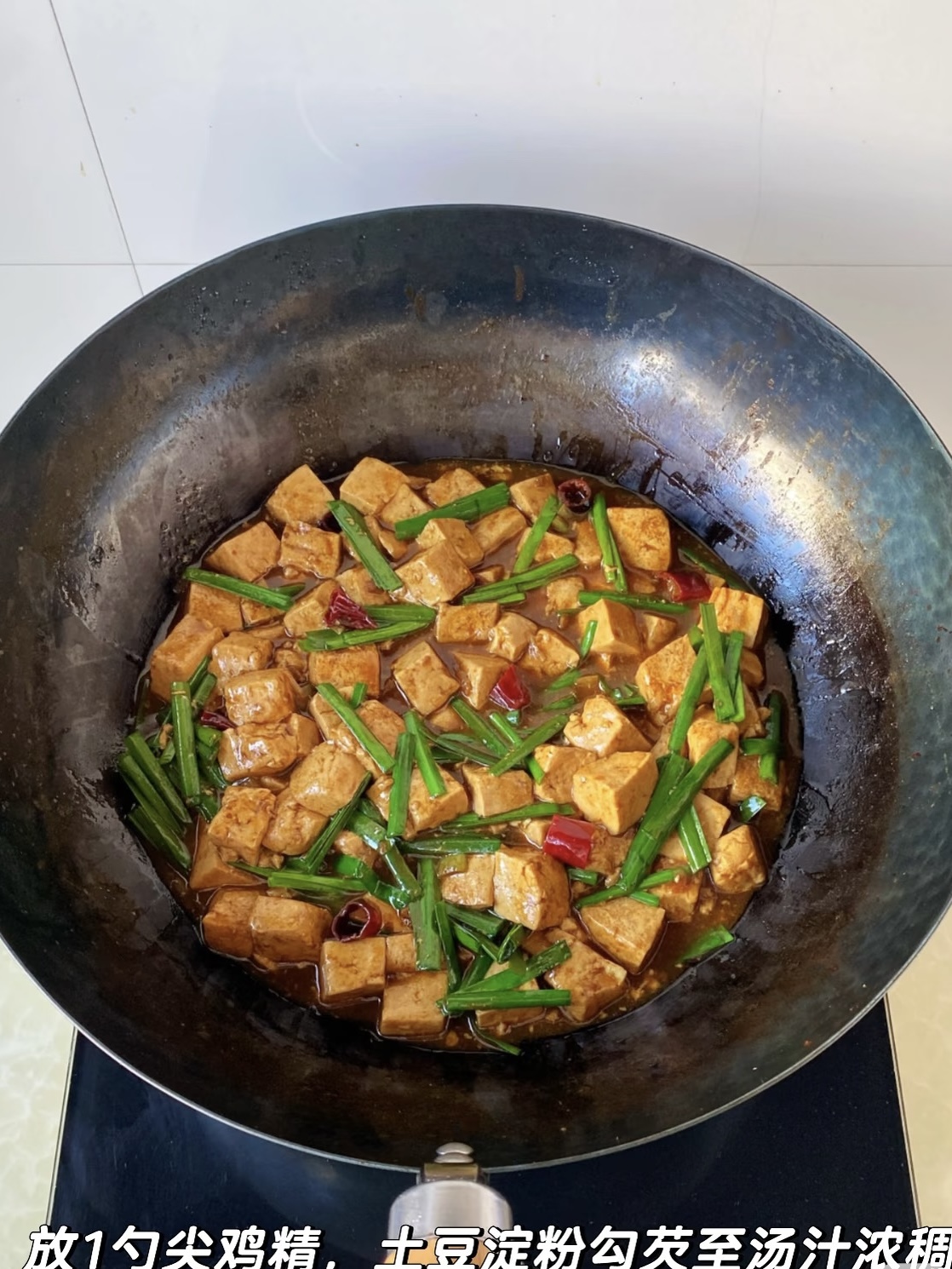 最后来一勺“魔法淀粉”。土豆淀粉+清水1:1调成水淀粉,沿锅边淋入,酱汁瞬间从“清汤”升级成“丝绸”,挂在豆腐表面能拉出“丝带尾”。再撒一勺鸡精提鲜,一把葱花增色,绿点金光,颜值瞬间+10086。关火趁热装盘,豆腐块块分明,表面亮到反光,像把夜市搬进碗里。