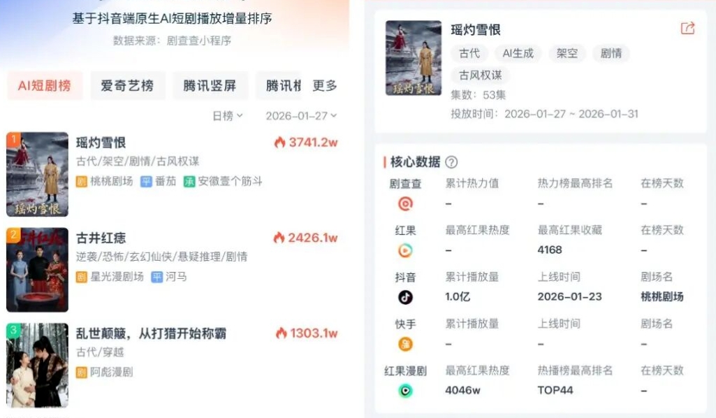 漫剧领域,盐言故事出的《瑶灼雪恨》,改编自短篇《我替皇姐复仇》,上线四天就冲到抖音AI短剧榜第一,播放量很快破亿。