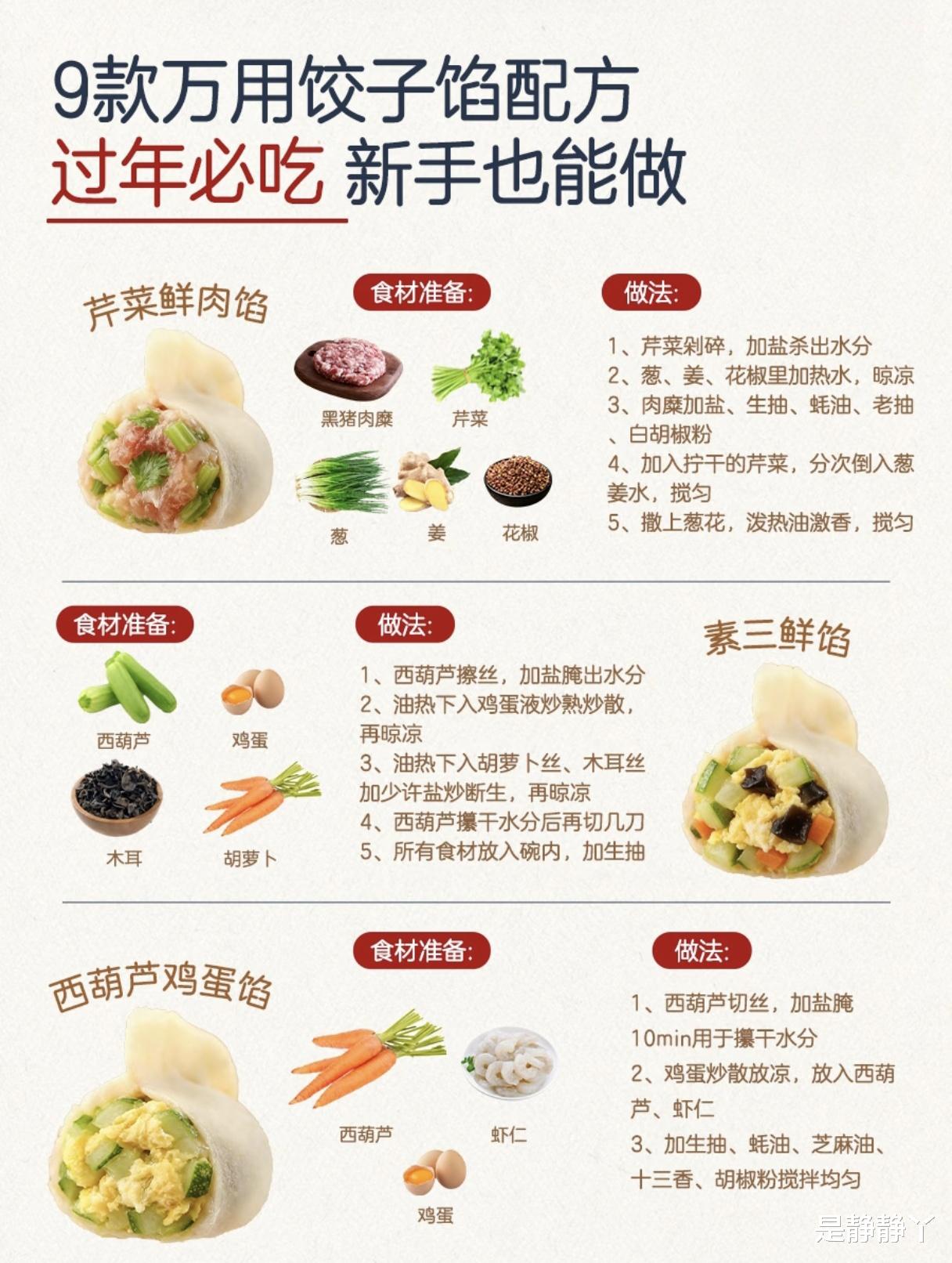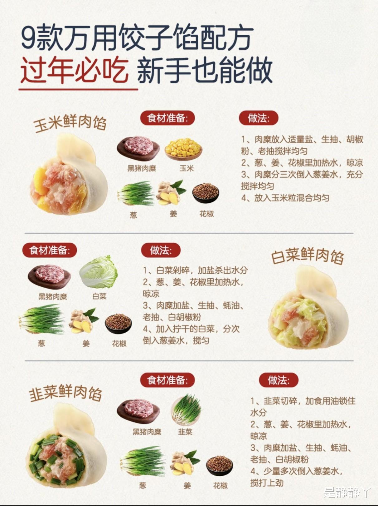 过年包饺子,是中国家庭的传统活动,尤其对于有孩子的家庭,这不仅是美食,更是亲子互动和传承家味的温馨时刻。今天分享的“9款万用饺子馅配方”,专为新手妈妈设计,食材常见、步骤简单,涵盖肉馅和素馅,每款都经过家庭实测,深受孩子和老人喜爱,让全家包饺子的时光充满欢笑与满足。