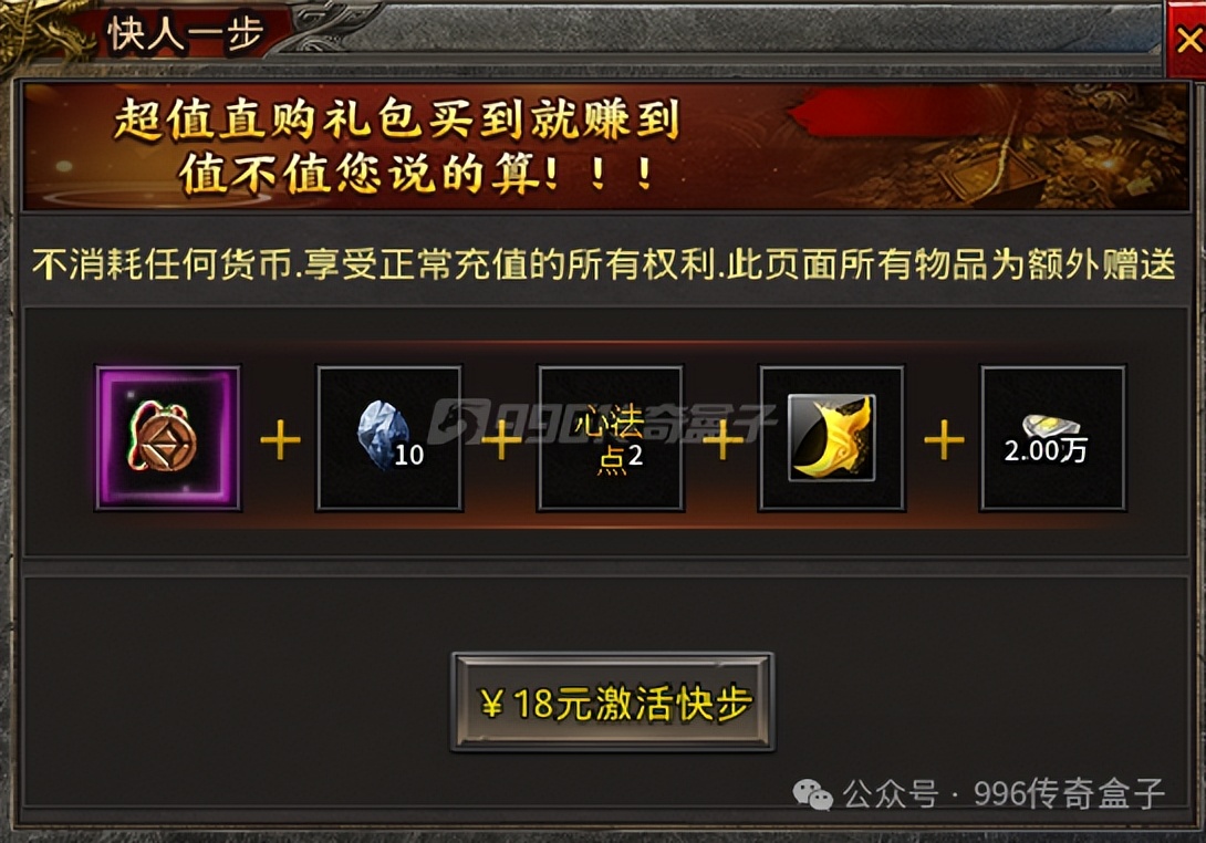 引导任务没几个,就是领取一些奖励,下了新手地图就没有了。一下图应该就能发现,这个服BOSS很多,非常多,而且刷新时间短且同步。职业选择上,战士也非常不错,站撸BOSS毫无压力,道士火符攻速非常快,会有一只白虎宝宝,法师群怪无敌,所以在职业选择上,可以按自己的喜好来。开启快人一步礼包有了小飞鞋,就可以开始刷BOSS了。