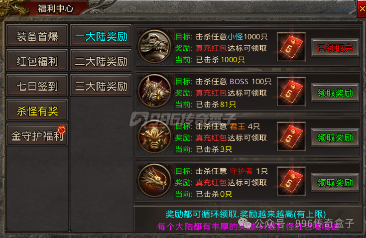 福利中心会有杀怪奖励的任务,每个大陆都有四个目标任务,每个目标任务又有好几个小任务,完成一个会出来下一个。每个任务完成都可以获得真充红包,这个红包能用来领取冠名。
