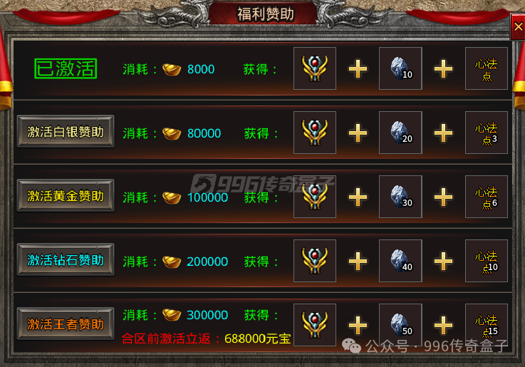 刷BOSS也会掉红包,红包还能开出绑定元宝,用来升级特殊或者领取赞助。这个元宝说不容易打吧,每个BOSS必爆,要说很容易吧,又有点供不应求。下图需要元宝,升级勋章斗笠这些要的元宝也不少,开启白银赞助就需要八万的元宝,攒起来也是有点费劲的。