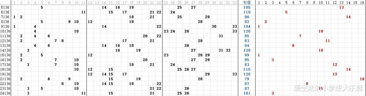26 28 29 33作为凤尾出现各3次,24 27作为凤尾出现各2次,22 31 32作为凤尾出现各 1 次。开出凤尾三路 0 路7次,1 路5次,2 路7次,凤尾三路中1路开出最少,总体三路较为平均。0路7次开出凤尾,其中33开出3次是本期热码凤尾,24 27各开出2次。1路凤尾5次开出,其中28开出3次是本期热码凤尾,最小凤尾22和31各开出1次。2路凤尾开出7次,其中26 29各开出3次是本期热码凤尾。
