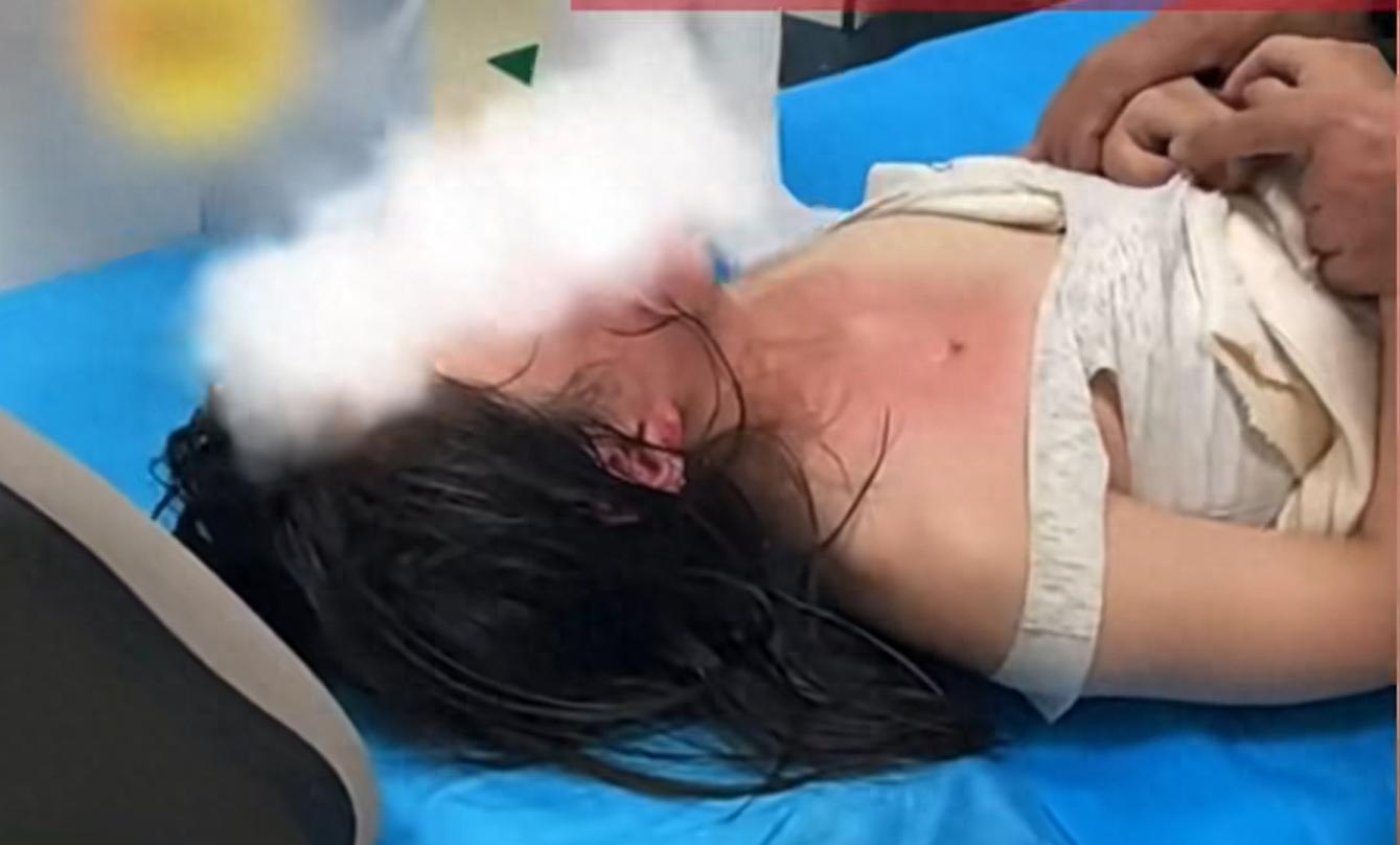 右半边脸通红,脖子、胸口、肚子上全是水泡,有些地方已经发白——那是深二度烫伤的标志。女孩疼得浑身发抖,咬破了下嘴唇。