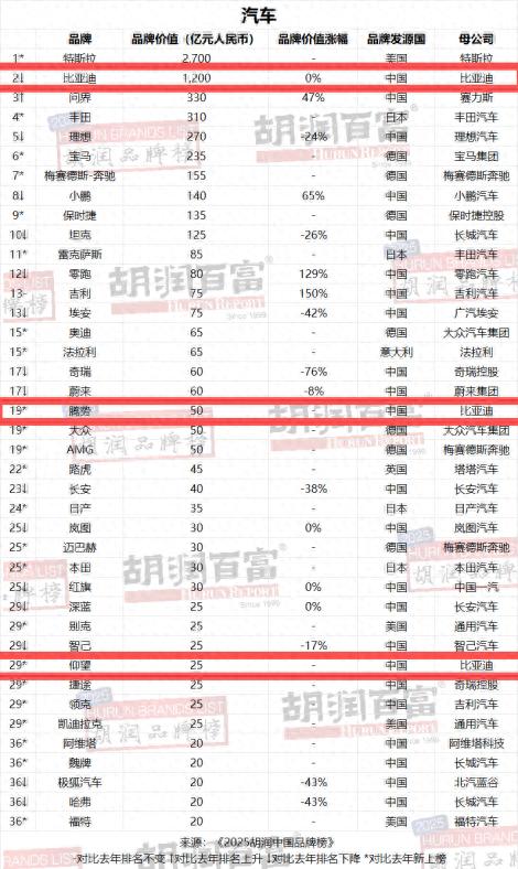 值得注意的是,比亚迪不仅自身表现强势,旗下高端品牌也开始进入全球汽车行业品牌序列。腾势以50亿元、仰望以25亿元的品牌价值首次上榜,说明比亚迪的品牌向上战略正在逐步兑现。