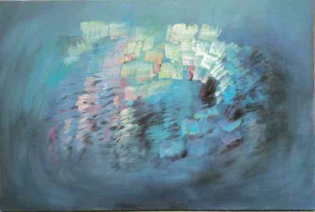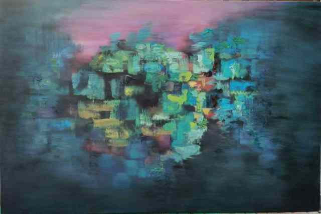 尤为可贵的是,余光明并未简单模仿赵无极、朱德群等前辈的抽象路径,而是以中国诗词为切入点,创作《唐·王维诗韵》系列,将“空山新雨后,天气晚来秋”的诗意转化为视觉语言。他借鉴中国画的散点透视与留白理念,打破西方焦点透视的束缚,使画面呈现出“惚兮恍兮,其中有象”的朦胧意境,实现了“诗中有画,画中有诗”的当代转化。