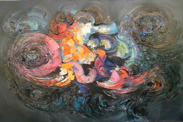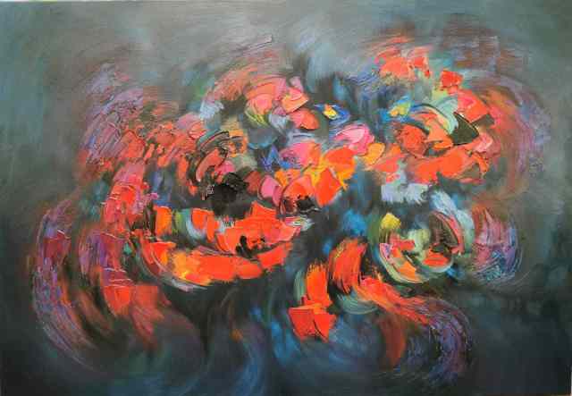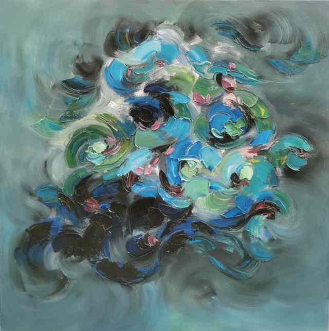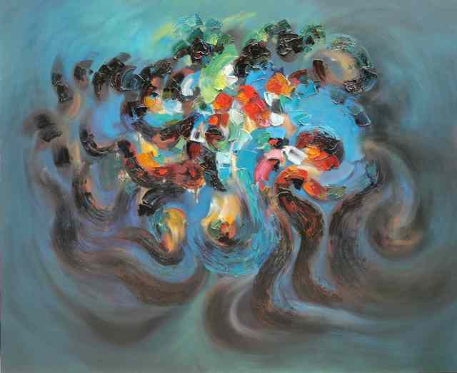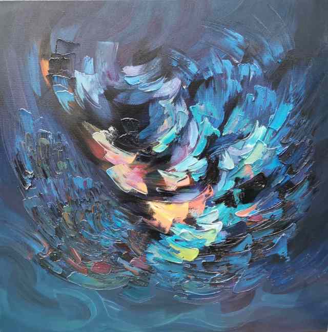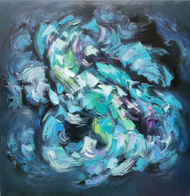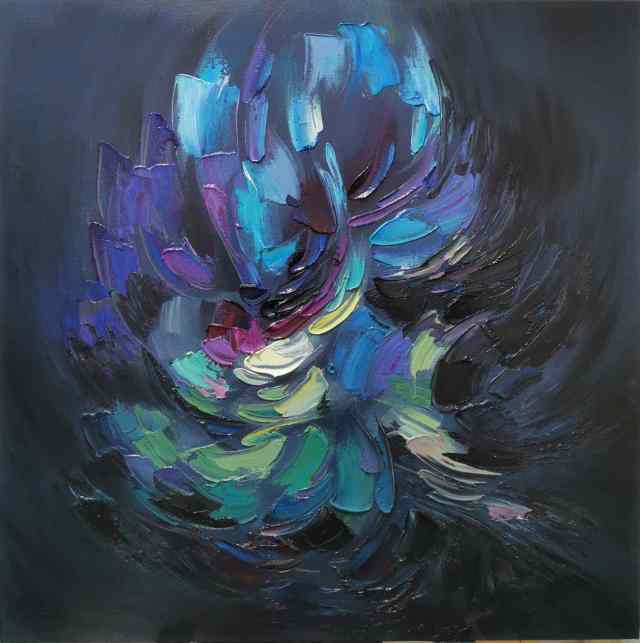 在《上善若水》系列中,他以水的流动性为灵感,通过冷暖色调的交织、虚实相生的构图,诠释道家“柔弱胜刚强”“无为而无不为”的哲学思想。画面中,蓝色如深渊静水,红色似生命奔涌,色彩在冲突中达成动态平衡,恰如“反者道之动”的辩证法则。而在《生生不息》系列中,他以厚重笔触与斑斓色彩表现生命的循环与张力,既见西方表现主义的激情,又蕴含“天人合一”的东方宇宙观。