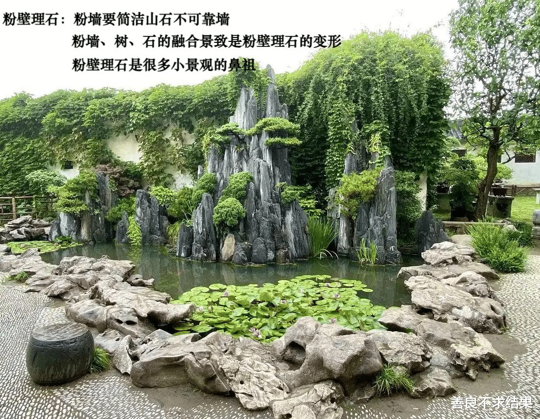 这其中,最能体现三者融合之美的,便是古人造园中的经典手法——“粉壁理石”,俗称“壁山”或“峭壁山”,也是墙、树、石融合的“鼻祖”,在《园冶》中有明确记载:“理者相石皴纹,仿古人笔意,植黄山松柏、古梅、美竹”。