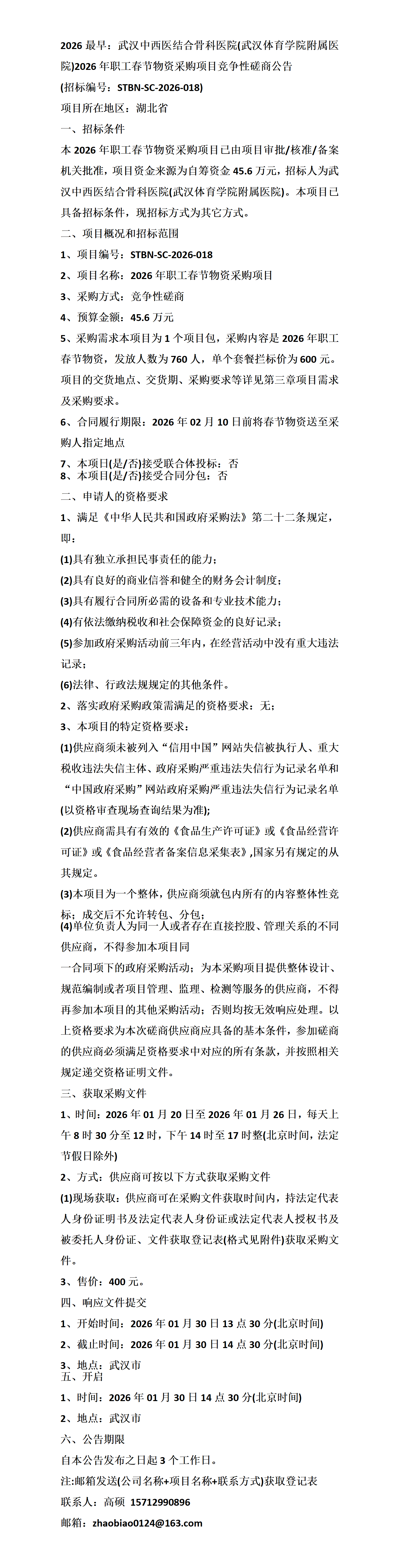 2026最早:武汉中西医结合骨科医院(武汉体育学院附属医院)2026年职工春节物资采购项目竞争性磋商公告