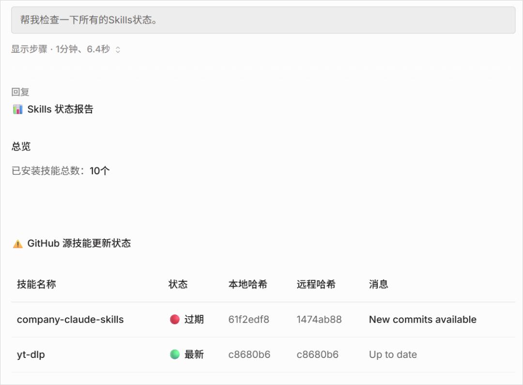 最终的结果中,如果输出的对应状态为过期,那就说明需要更新对应的Skills了,若为状态为最新则说明无需更新。
