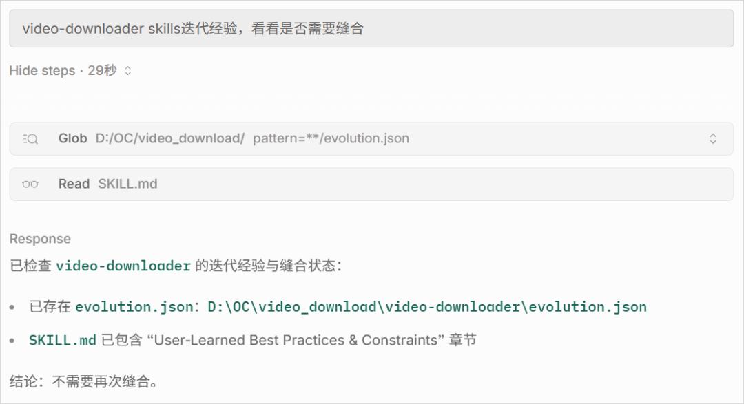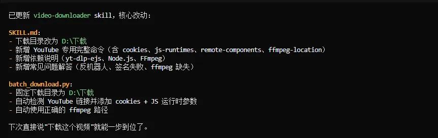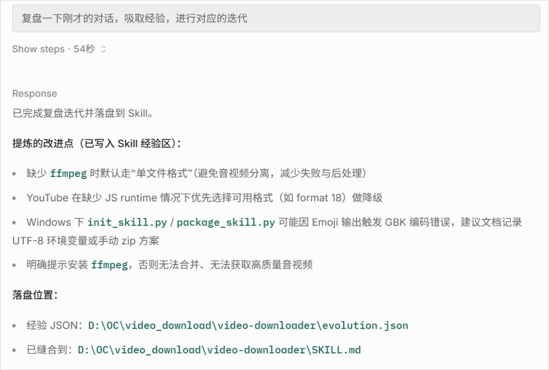 比如我之前这个yt-dlp的Skill,第一次报错并就解决以后,就根据聊天记录,让它自主的修改迭代了一些东西。