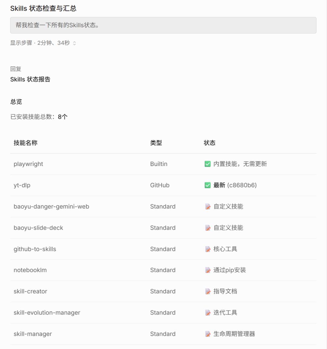不过现在通过这个skill-manager,它可以直接给我吐出一个好看点的表格,列出所有Skills的类型、描述、版本,而且是可以自己区分哪些是GitHub打包的skill,哪些是正常的skill,真就是可以列出我所有家底。