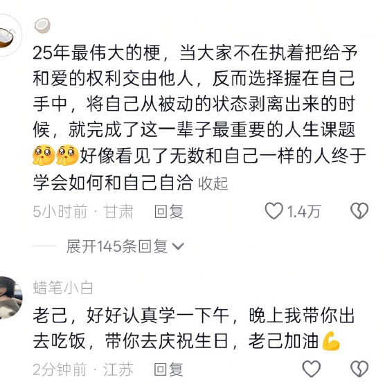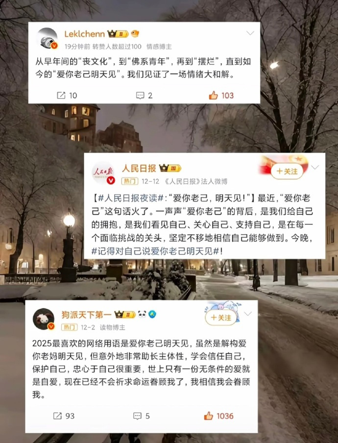 今日所要探讨的是一个于近期在互联网上被称作“2025最温柔流行语”的热梗,即“爱你老己”。