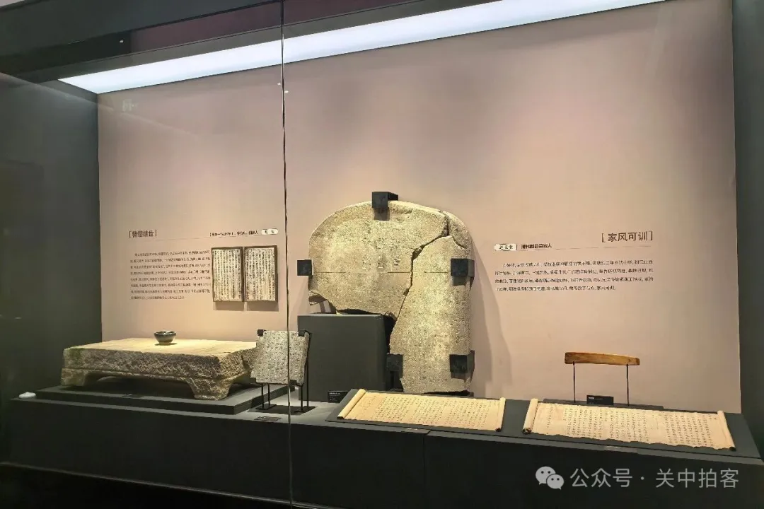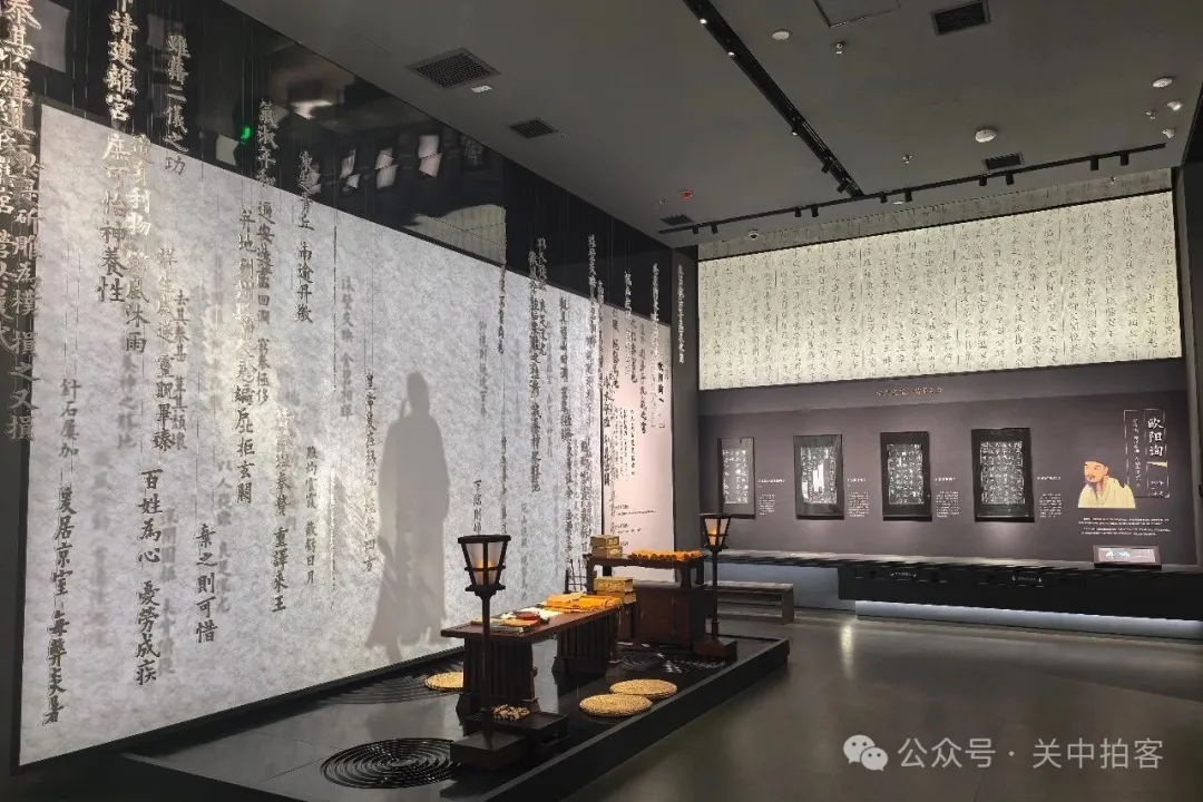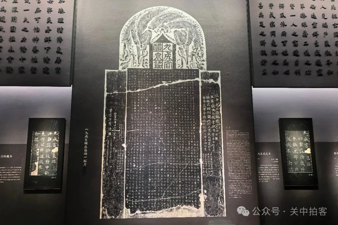 在三层的展厅内,以“千年书脉”为主题,展示了以《九成宫醴泉铭碑》为代表的隋唐楷书艺术。唐贞观六年(632年)夏历四月,唐太宗李世民在九成宫避暑,偶然发现泉水,命名为“醴泉”。随后,令魏征撰文,欧阳询书丹,雕刻石碑,竖立于此。